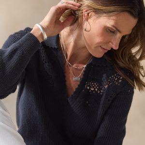Subtle details make this allover rib sweater so special. with a hand-crocheted yoke and picot trim at V-neckline. Recycled wool/merino wool/cotton/nylon. Hand wash. Imported. Exclusive. Sizes XS (0?C2). S (4?C6). M (8?C10). L (12?C14). XL (16?C18). XXL (20?C22). Approx. 22l.