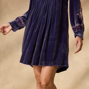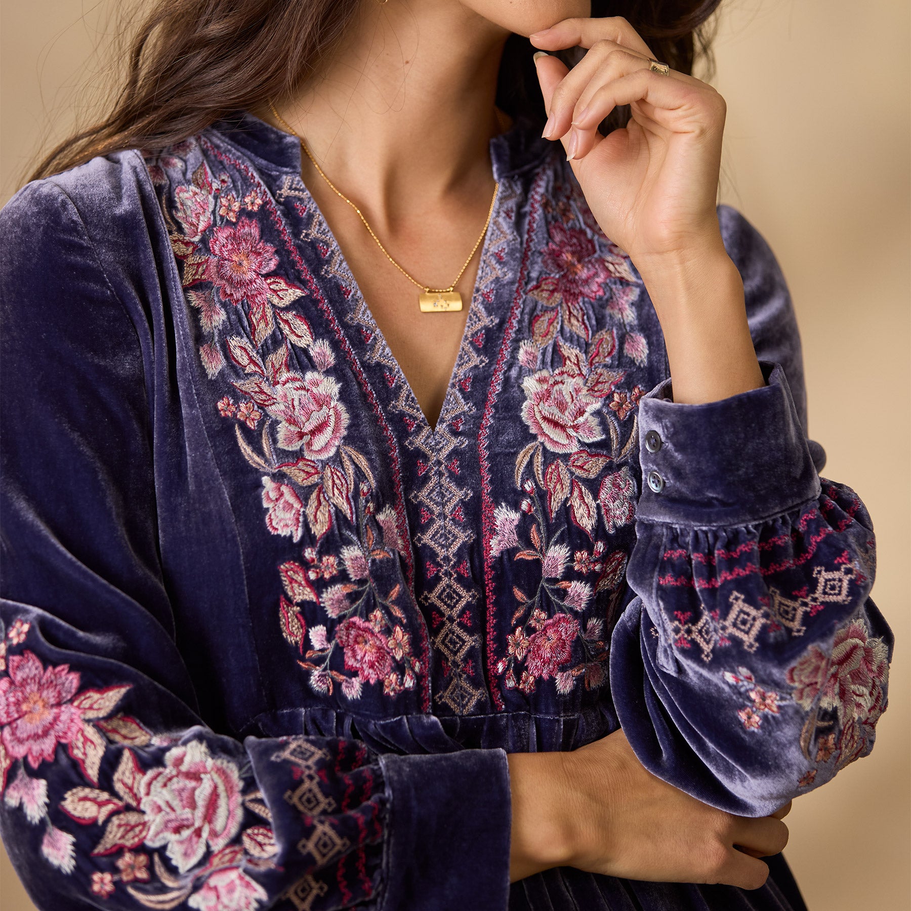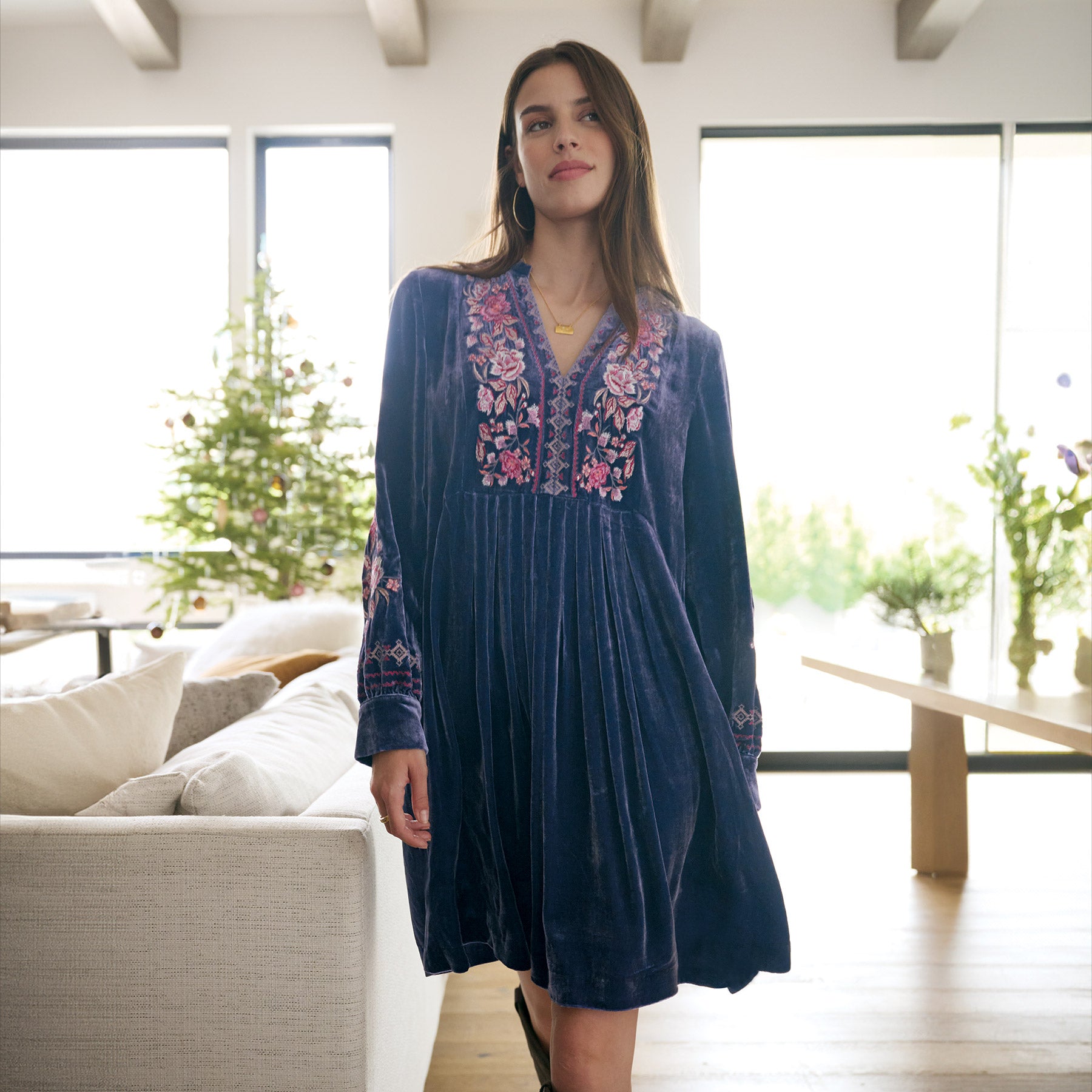 So luxurious. our velvet notch neckline popover dress is blooming with lovely embroidery on the front placket. two side seam pockets and pleating details. Viscose/silk. Dry clean. Imported. Exclusive. Sizes XS (0–2). S (4–6). M (8–10). L (12–14). XL (16–18). XXL (20–22). Approx. 37l.