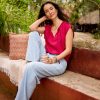 Silky and gorgeous mixed and border print pajama bottoms. so elegant. with wide leg silhouette. elastic drawstring waistband with ruffle detail and side seam pockets. Easy fit and flowing. Viscose. Machine wash. Imported. Exclusive. Sizes XS (0–2). S (4–6). M (8–10). L (12–14). XL (16–18). XXL (20–22). 28 inseam.