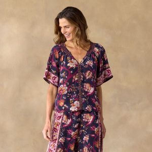 Silky and gorgeous mixed and border print pajama top. so elegant with smocked neckline and eyelet laundry button front. Easy fit. Viscose. Machine wash. Imported. Exclusive. Sizes XS (0?C2). S (4?C6). M (8?C10). L (12?C14). XL (16?C18). XXL (20?C22). Approx. 23l.