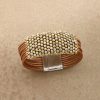 With a name that means cross. the Cruz Bracelet’s striking pattern will elevate your everyday style. This remarkably beautiful beaded cuff from Etkie was meticulously handloomed by artisans in New Mexico who draw inspiration from the Southwest and the traditions of the indigenous people there. It is said that the artisans leave a part of their spirit in each bracelet they weave. making yours one of a kind. Formed from a flexible copper band lined in leather and covered in glass seed beads. USA. 2 1/2 dia.. 1/2w.