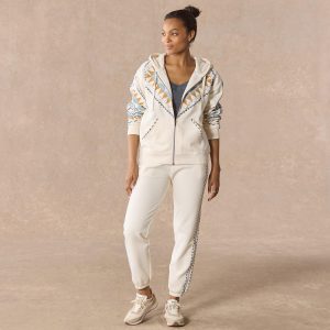 Our stylish and comfortable joggers in a straight leg fit are so beautiful and classy in fleece with stunning geometric embroidery at the side seams. on seam welt pockets and drawstrings at the elastic waist for the perfect fit. Cotton/polyester. Machine wash. Imported. Exclusive. Sizes XS (0?C2). S (4?C6). M (8?C10). L (12?C14). XL (16?C18). XXL (20?C22). 28 inseam.