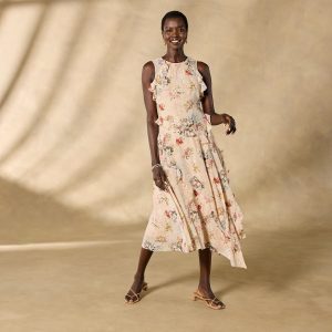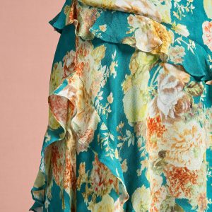 A gorgeous floral print enchants on our romantic dress. with angled. fluttery ruffles. asymmetrical hem. deep side slit. smocked neckline and keyhole button back. Fully lined. Viscose. Machine wash. Imported. Exclusive. Sizes XS (0-2). S (4-6). M (8-10). L (12-14). XL (16-18). XXL (20-22). Approx. 43.5l.