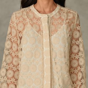 Exquisite lace is accompanied by a covered placket with buttons and scalloped trim and covered buttons on the cuffs. Cami included. Polyester. Dry clean. Imported. Sizes XS (0 to 2). S (4 to 6). M (8 to 10). L (12 to 14). XL (16 to 18). XXL (20 to 22). Approx. 24L.