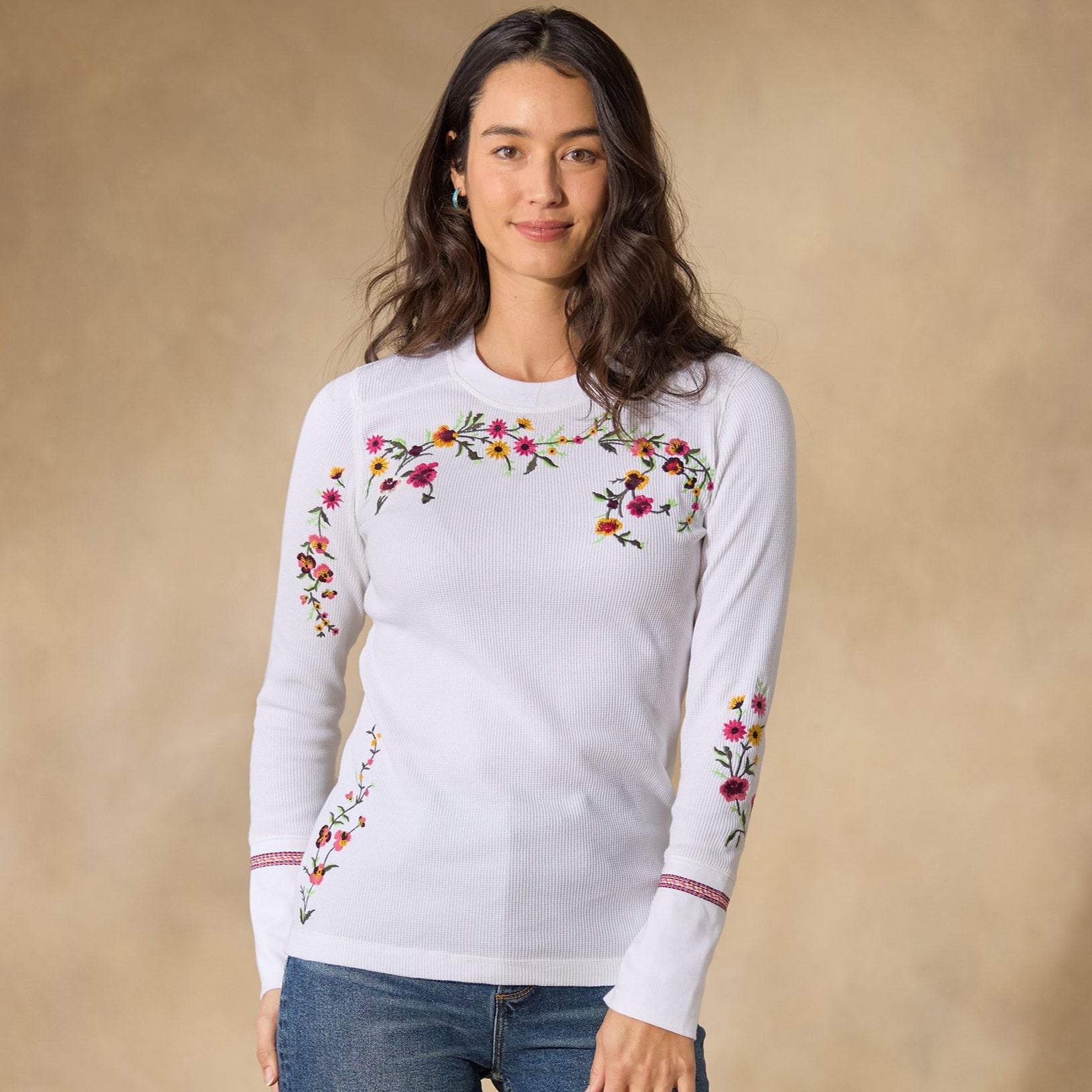 A Sundance classic body in new floral embroidery. our comfortable crewneck thermal boasts wide cuffs accented with velvet trim detail and metal buttons. Cotton/spandex. Machine wash. Imported. Exclusive. Sizes XS (0–2). S (4–6). M (8–10). L (12–14). XL (16–18). XXL (20–22). Approx. 25.5l.