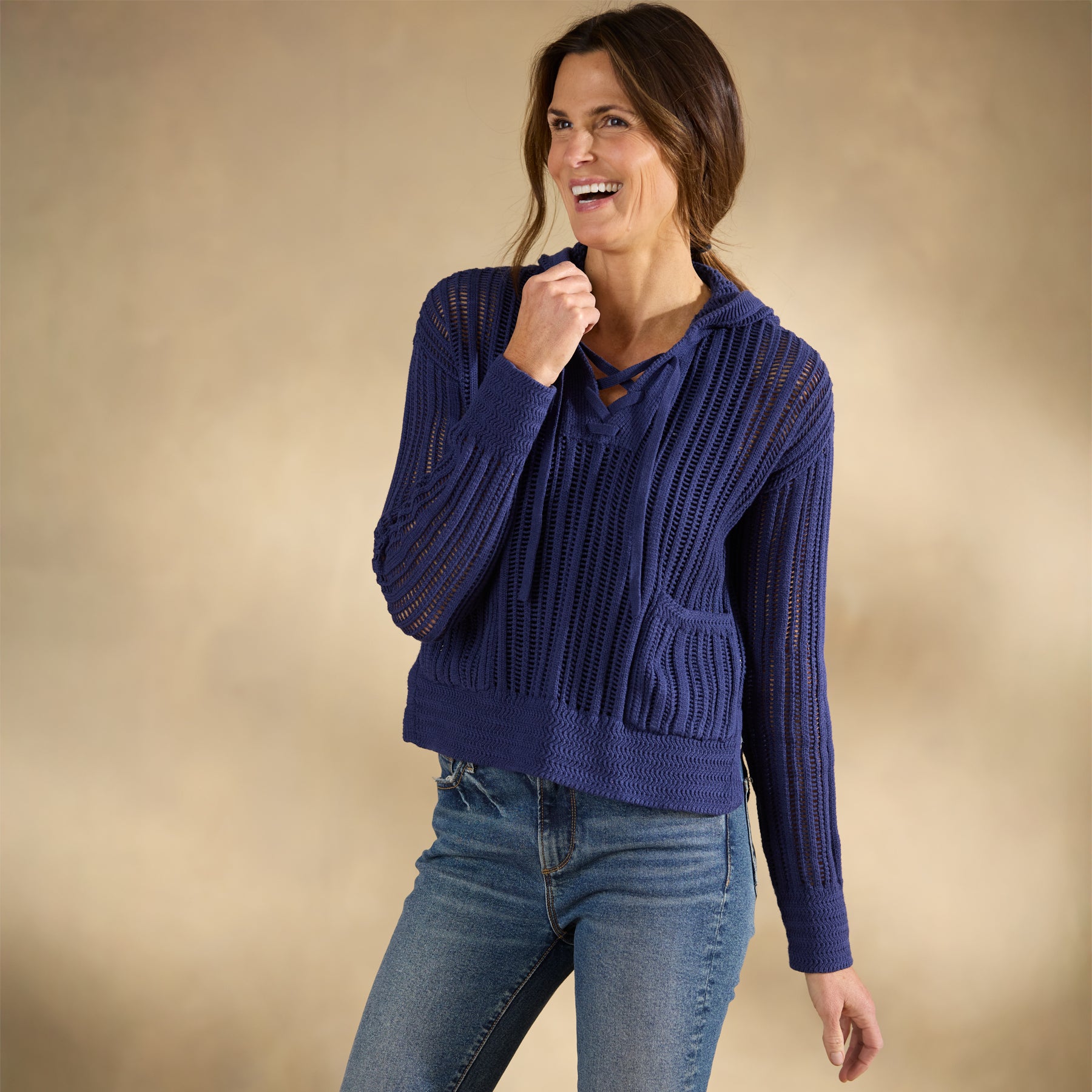 Our Harbor Call Hoodie is the grown-up version of your favorite childhood pullover: a soft open-stitch sweater with a drawstring hood. patch pockets and just-right beachy vibes. Cotton/rayon/nylon. Hand wash. Imported. Exclusive. Sizes XXS (00). XS (0–2). PS (4–6). M (8–10). L (12–14). XL (16–18). Approx. 18.5l.