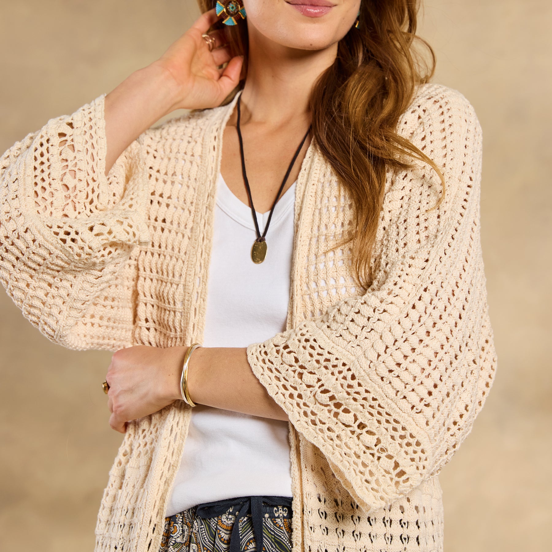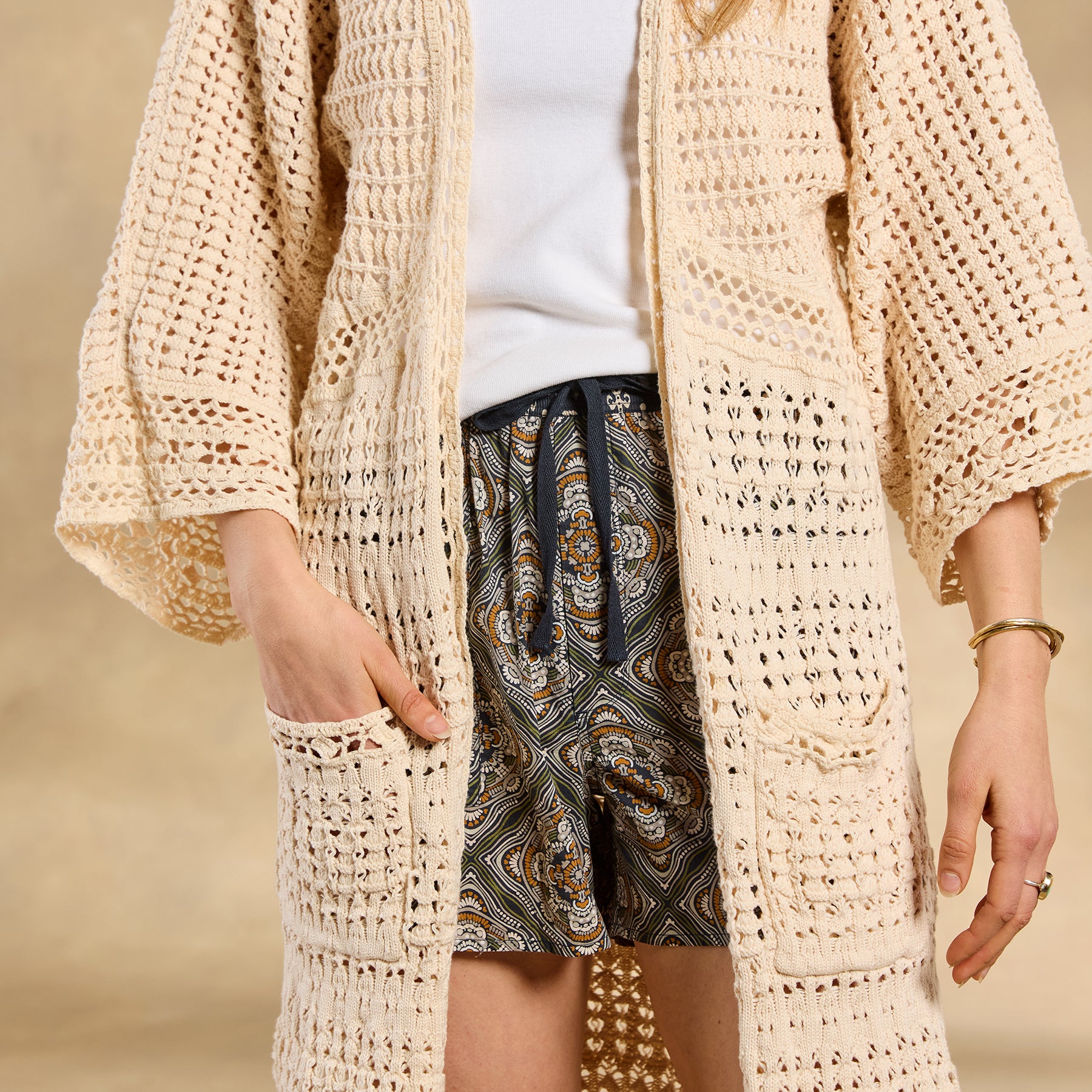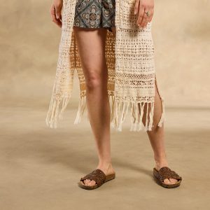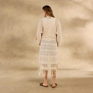 The ultimate neutral statement layer. our Island Sands Duster is absolutely brimming with special details—from mixed-stitch construction and hand-crocheted details to flirty fringe. Open front; patch pockets. Cotton. Hand wash. Imported. Exclusive. Sizes XS/S (0–6). M/L (8–14). XL/XXL (16–22). Approx. 42l.