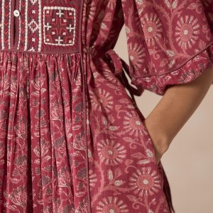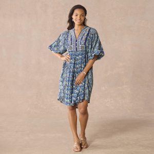 Our easy pop over dress is mixed printed and finished with stunning embroidery at the placket. a flattering V-notch neckline with three looped buttons and puff sleeves with elastic cuffs. Side ties to gather at the center front and back for the perfect fit. Cotton/viscose. Machine wash. Imported. Exclusive. Sizes XXS (00). XS (0–2). S (4–6). M (8–10). L (12–14). XL (16–18). Approx. 38.5l.