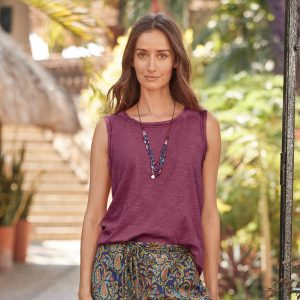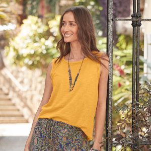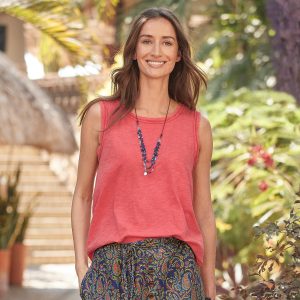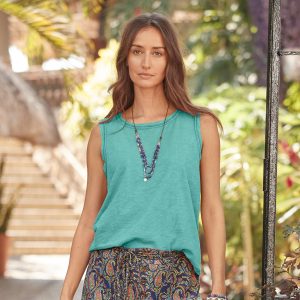 Our cotton slub muscle tank has the cleanest silhouette. with exposed stitching and raw-edge details. Slight hi-lo hem. Machine wash. Imported. Exclusive. Sizes XS (0–2). S (4–6). M (8–10). L (12–14). XL (16–18). XXL (20–22). Approx. 25l.