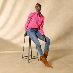Tonal embroidery lends understated elegance to our textured button-down top with novelty trim detail. ladder lace and shirring at the back yoke. Cotton. Hand wash. Imported. Exclusive. Sizes XS (0–2). S (4–6). M (8–10). L (12–14). XL (16–18). XXL (20–22). Approx. 25.5l.