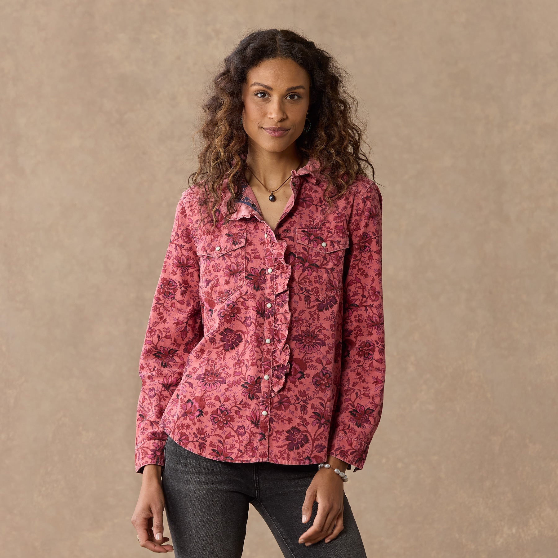 Floral printed and over-dyed. this Western inspired. soft corduroy shirt is beautiful with ruffles at the neckline for a feminine twist. Two patch pockets. snap closure and bandana print detail inside. Cotton. Machine wash. Imported. Exclusive. Sizes XS (0?C2). S (4?C6). M (8?C10). L (12?C14). XL (16?C18). XXL (20?C22). Approx. 26l.