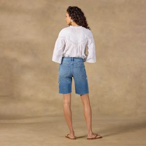 The softest denim bermuda shorts. elevated with artful floral applique??and frayed just so! Cotton/polyester/spandex. Machine wash. cold. Imported. Sundance exclusive. Sizes 24?C32. Approx. 9 inseam; 11 rise; 20 leg opening.