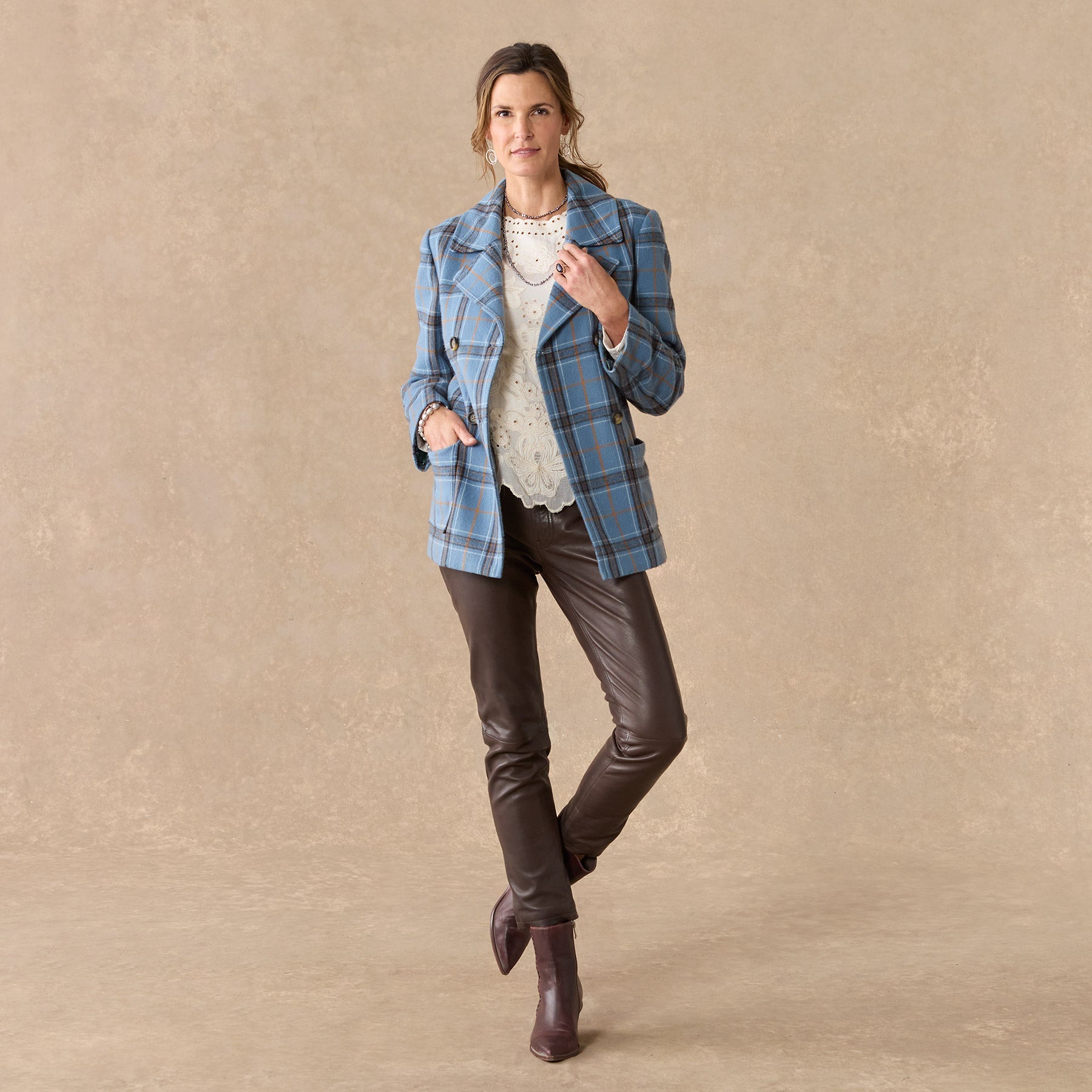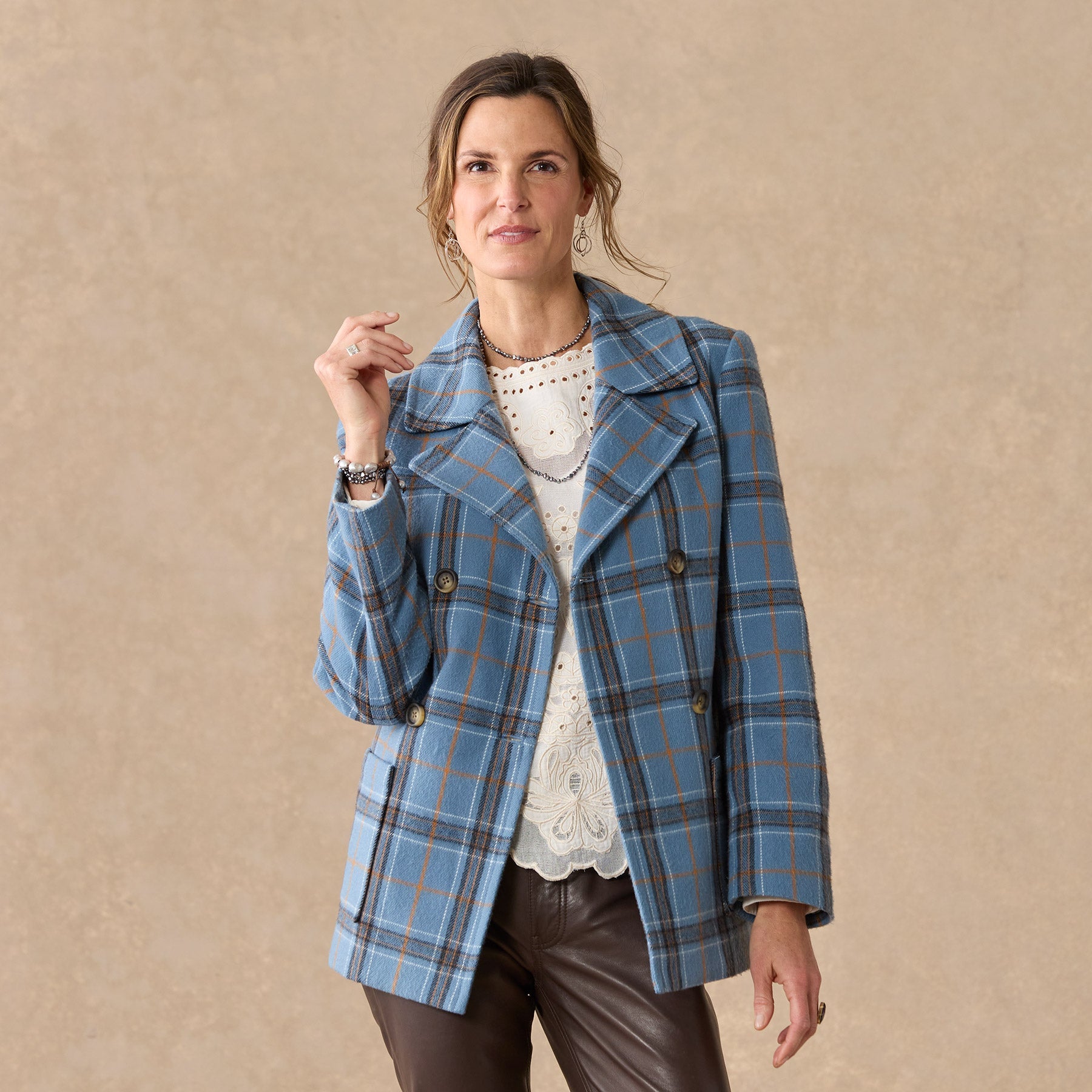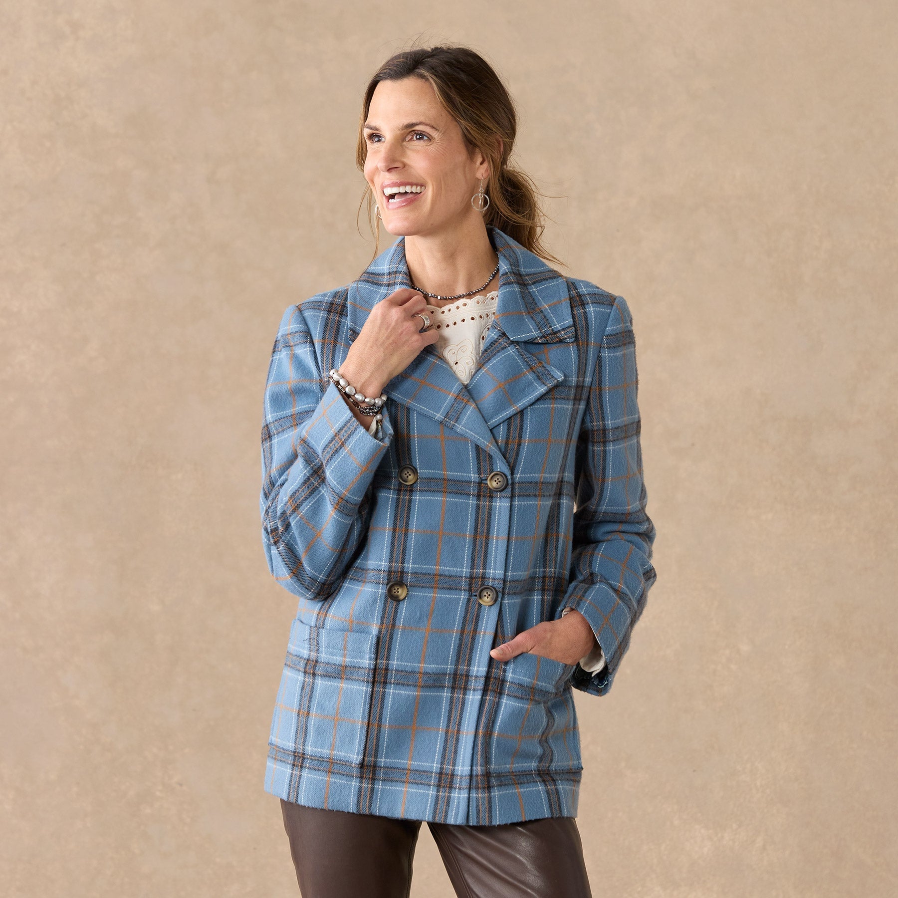 Our smart. brushed flannel plaid pea coat is soft. classic and beautiful. Double breasted. with faux horn buttons. patch pockets and a fun. floral-printed lining. Polyester. Dry clean. Imported. Exclusive. Sizes XXS (00). XS (0?C2). S (4?C6). M (8?C10). L (12?C14). XL (16?C18). Approx. 27l.